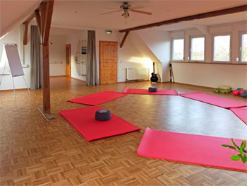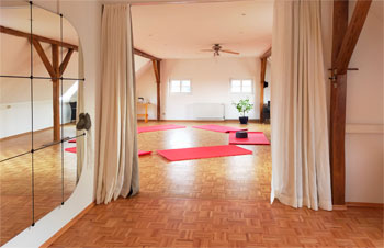 Der Raum hat eine Gesamtgröße von 88 qm². Er lässt sich unterteilen in zwei kleinere Kursräume von je 70 qm² und 18 qm². Flur, Garderobe und WC sind vorhanden sowie ausreichend Parkplätze.